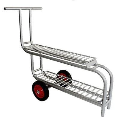 Steel trolley designed to hold up to 35 discuses over two levels. Trolley has hard wheels and painted finish.