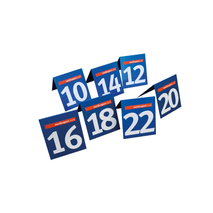 Set of 14 distance markers made of powdercoated aluminium which provides a strong yet light marker that is rustfree. A frame shape provides better stacking. Distances are two of each 10, 12, 14, 16, 18, 20 and 22m.