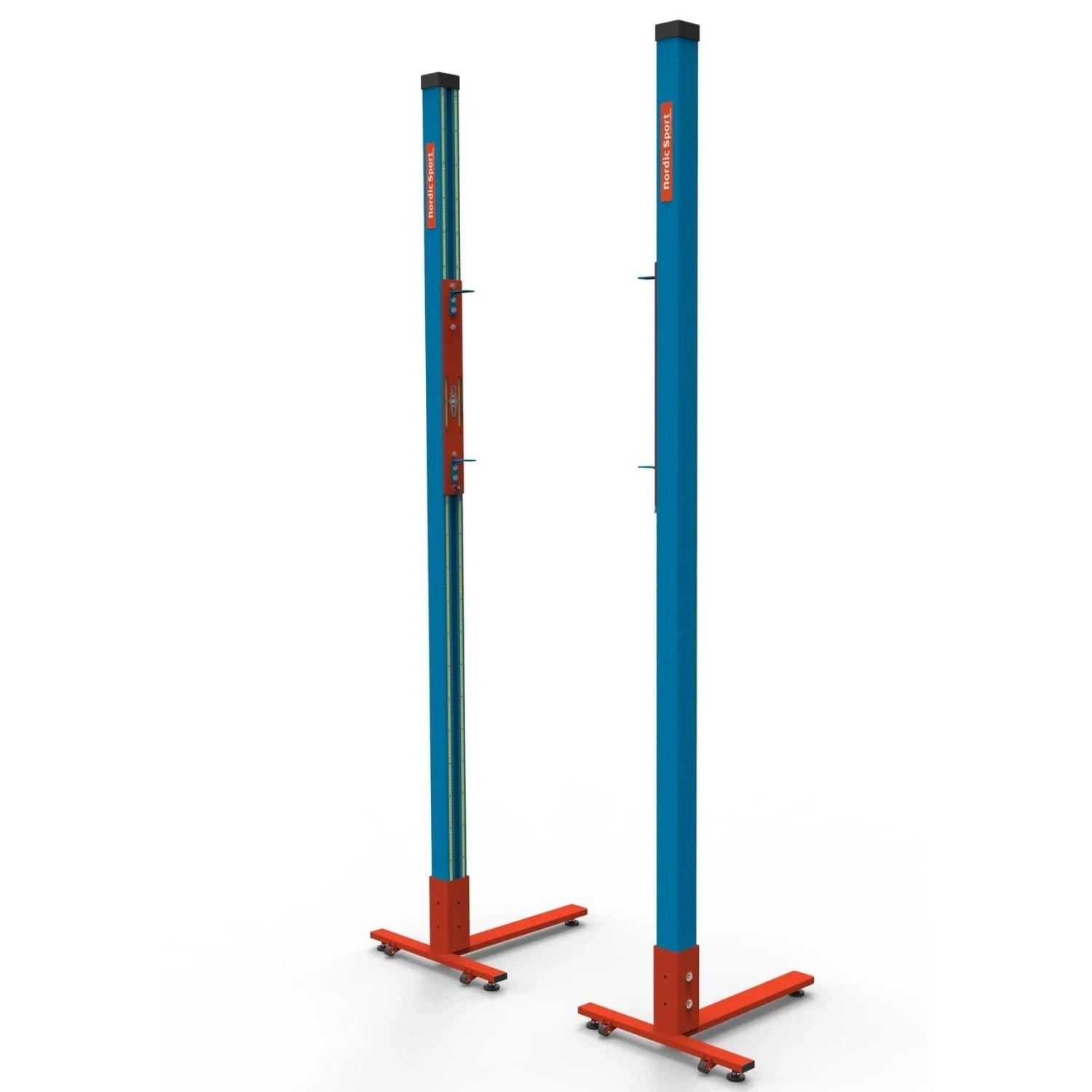 Our top of the line high jump stand. Made of our specially designed profile of extruded aluminium. Height adjuster with double readouts for comfortable and accurate setting even at world record heights. Adjustable T-base made of galvanised steel. Measures from 40cm to 256cm. WA Certified No E-99-0006.