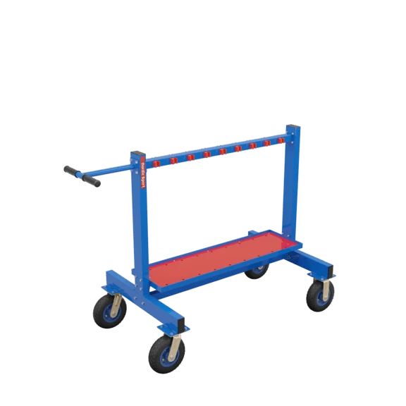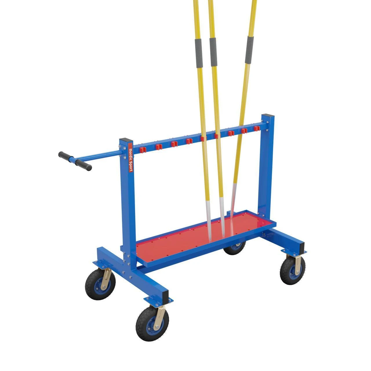 Steel trolley designed to hold 18 javelins in upright positions without the javelins touching. Trolley has pneumatic rubber wheels and painted finish.