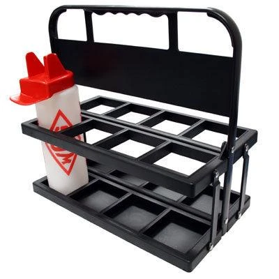 Durable molded plastic bottle carrier folds down flat for easy storage and carrying when not in use.