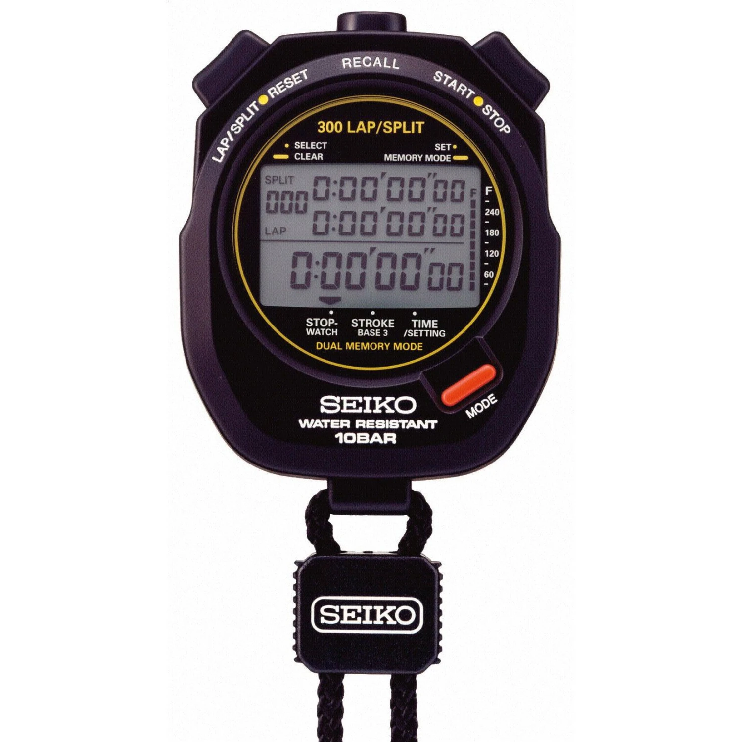 Large-sized three row display panel for split/lap and total time Dual memory mode * Single memory mode — Up to 300 split or lap times can be stored and recalled either during or after measurement. * Block memory mode — A sequence of measurement data obtained from race start to finish is recorded as a block. Up to 100 blocks of data can be stored in memory without deleting the previous data (memory segregated by event) Measurable up to 10 hours in 1/100 of a second Measures and stores strokes per minute for events such as swimming and rowing and stores up to 9 data Memory recall during operation ID No. function useful for keeping the data of individual users Battery life indicator.